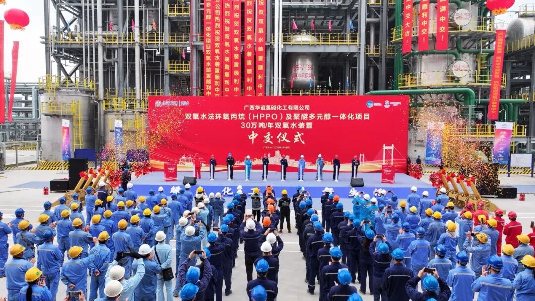 近日,广西华谊氯碱化工有限公司举行双氧水法环氧丙烷(HPPO)及聚醚多元醇一体化项目30万吨/年双氧水装置中交仪式,标志着该装置全面建成,正式由工程建设阶段转入生产准备阶段,为HPPO项目全线投产奠定了关键基础。