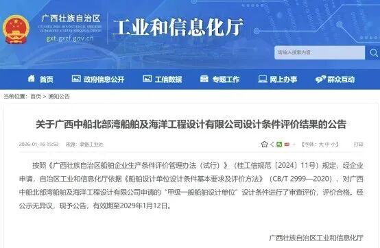 近日,中船集团下属中船广西公司所属设计公司成功通过广西壮族自治区工业和信息化厅审查评价,获颁“甲级一般船舶设计单位”资质,标志着该公司在广西船舶设计领域的技术实力和综合能力得到官方认证。