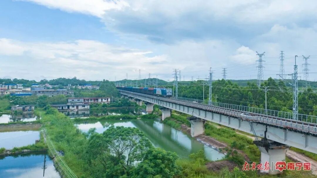 一列西部陆海新通道铁海联运班列在广西沿海铁路上行驶。
