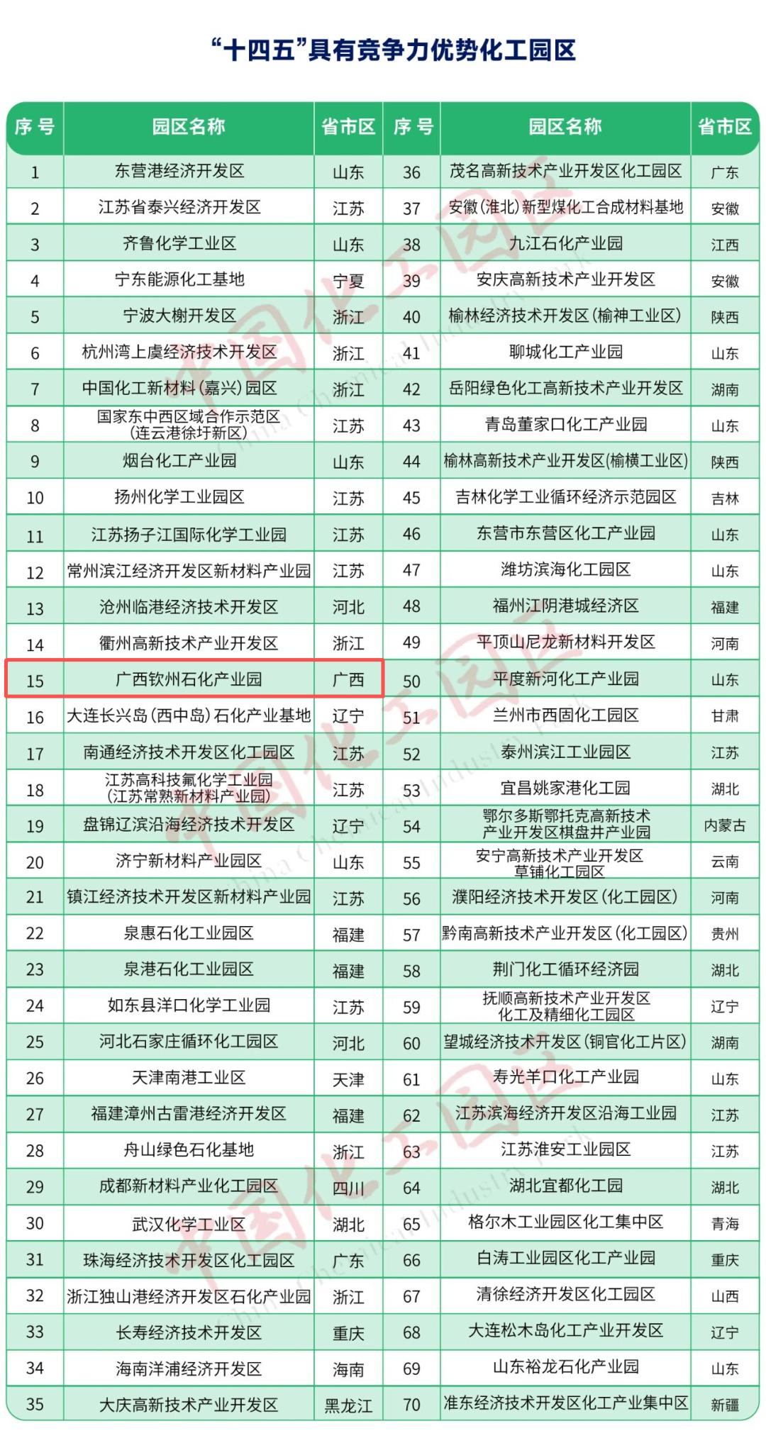 近日,“2025中国化工园区发展大会”在浙江嘉兴召开。会上,中国石油和化学工业联合会发布《“十四五”具有竞争力优势化工园区名录》。钦州石化产业园成功入选“十四五”具有竞争力优势化工园区,名列第15位,是广西唯一上榜的专业化工园区。