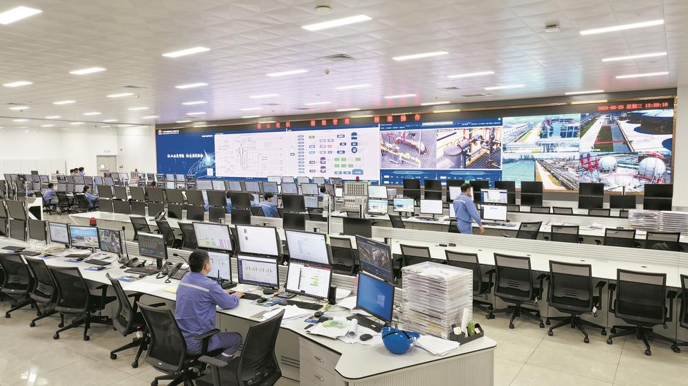 在华谊钦州一体化基地项目中控室,工作人员监控数字化控制平台。