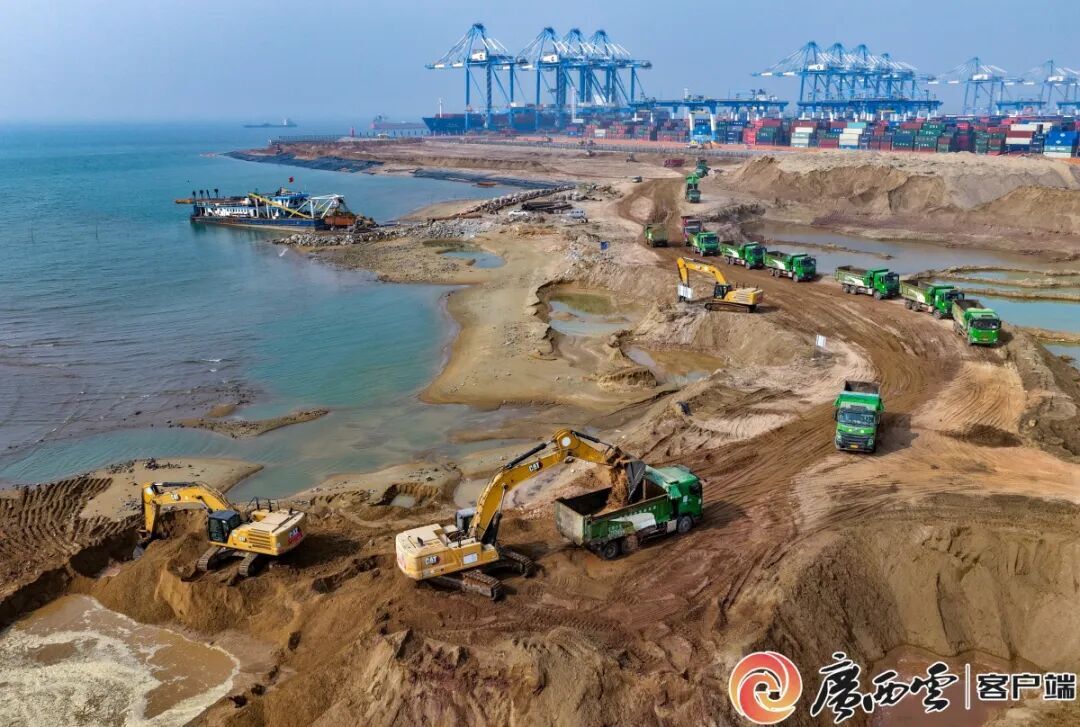 近日,在位于北部湾港钦州自动化集装箱码头南侧的扩建项目工地上,各种施工机械正加紧作业。该扩建项目将建成5个5000吨级自动化集装箱泊位,年设计通过能力65万标准箱。平陆运河通航后,这些泊位将专门承接来航的中小型船舶,释放钦州港现有大泊位能力,完善与平陆运河衔接的江海联运体系。