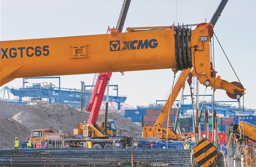 11月16日,在钦州港自动化集装箱码头南侧的扩建项目工地上,各种施工机械正加紧作业。钦州港域现有的专业化集装箱泊位以5万吨级以上为主,该扩建项目将建设5个5000吨级自动化集装箱泊位,年设计通过能力65万标准箱。(记者周军 通讯员李喜浩 摄)