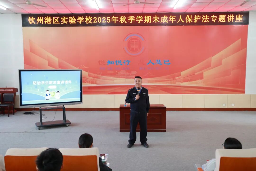 宣传队伍走进钦州港经济技术开发区实验学校,分局民警以法治讲座与趣味互动相结合的形式,向学生讲解《中华人民共和国未成年人保护法》相关知识,重点聚焦“预防校园欺凌”,引导同学们树立法治观念,学会用法律保护自己,营造平安和谐的校园环境。