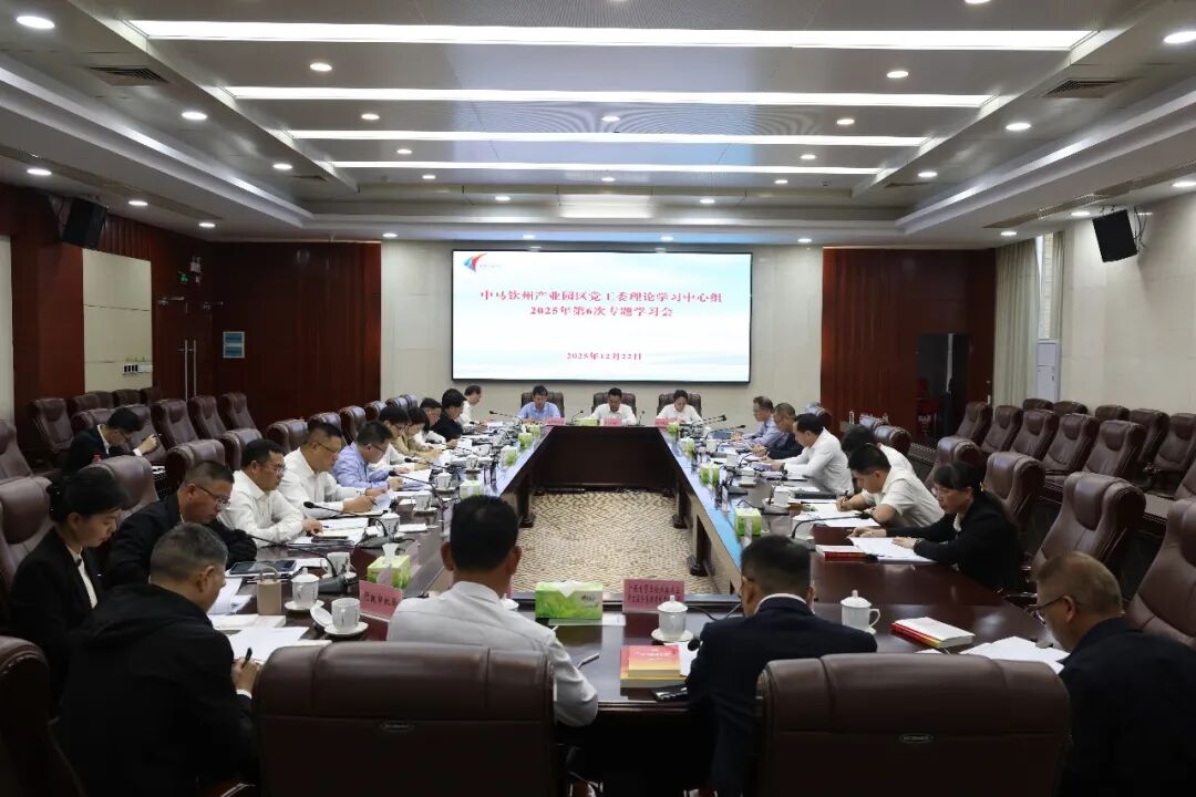 12月22日,中马钦州产业园区党工委理论学习中心组举行2025年第6次专题学习会,深入学习贯彻习近平新时代中国特色社会主义思想,深刻领会党的二十届四中全会精神、自治区党委十二届十一次全会精神的核心要义和实践要求,聚焦园区“十五五”规划进行集中研讨。中马钦州产业园区党工委副书记、管委会常务副主任毛任建主持会议并讲话。