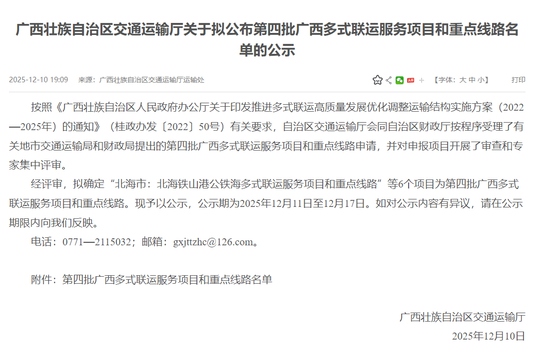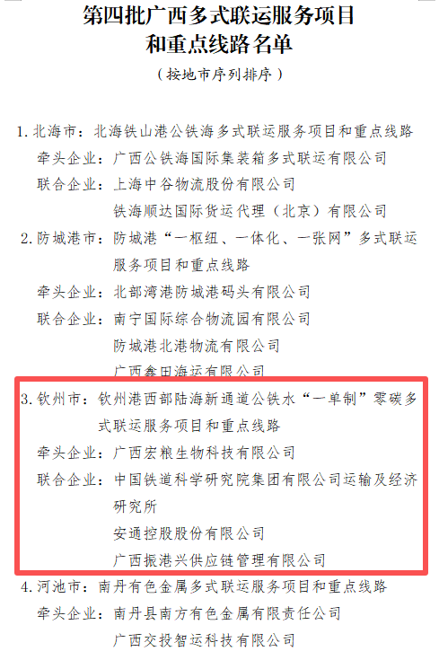 近日,广西壮族自治区交通运输厅公布了第四批广西多式联运服务项目和重点线路名单。“钦州港西部陆海新通道公铁水‘一单制’零碳多式联运服务项目和重点线路”成功入选。