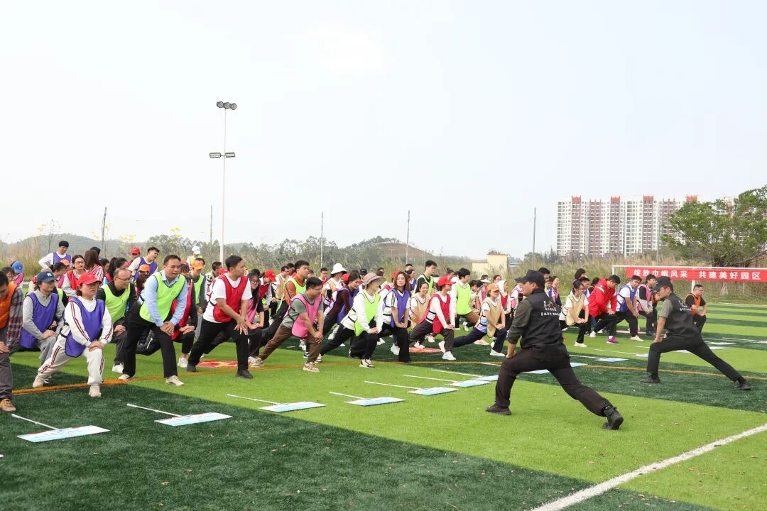 运动会现场,教官带领参赛队员做热身运动。